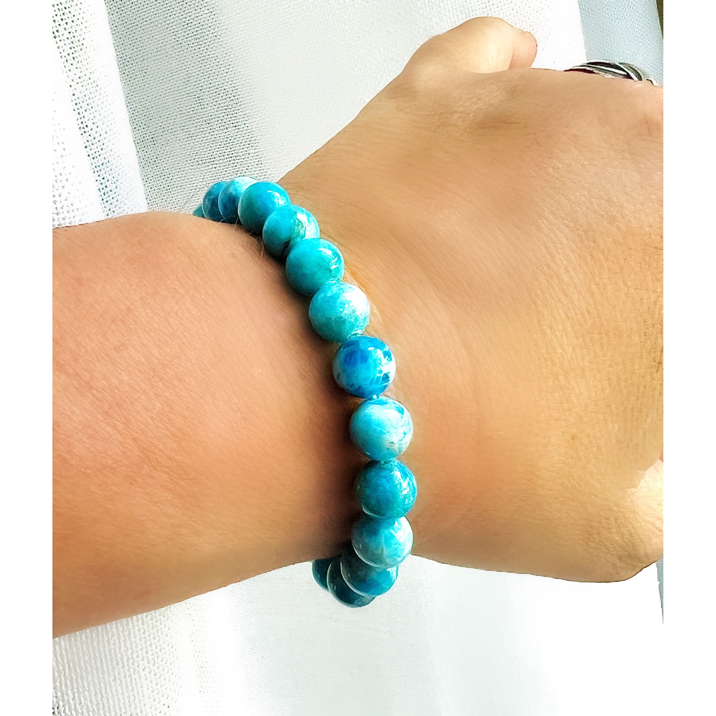 Immerse yourself in the calming yet energizing beauty of our Apatite Gemstone Stretch Bracelet, featuring AAA-quality natural apatite beads in mesmerizing shades of turquoise blue. Each bead showcases unique oceanic swirls of light and dark blue, making every bracelet one of a kind.
