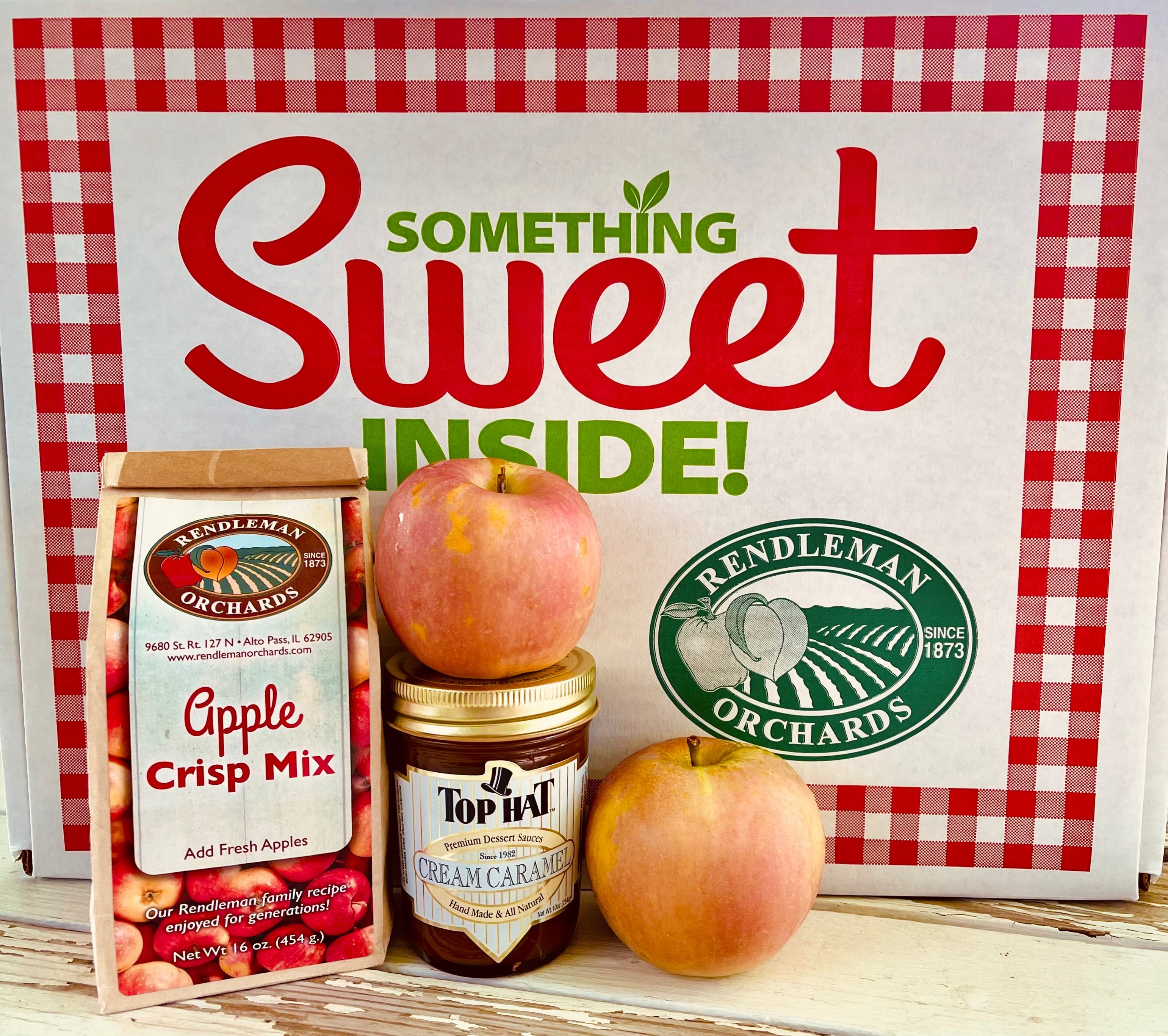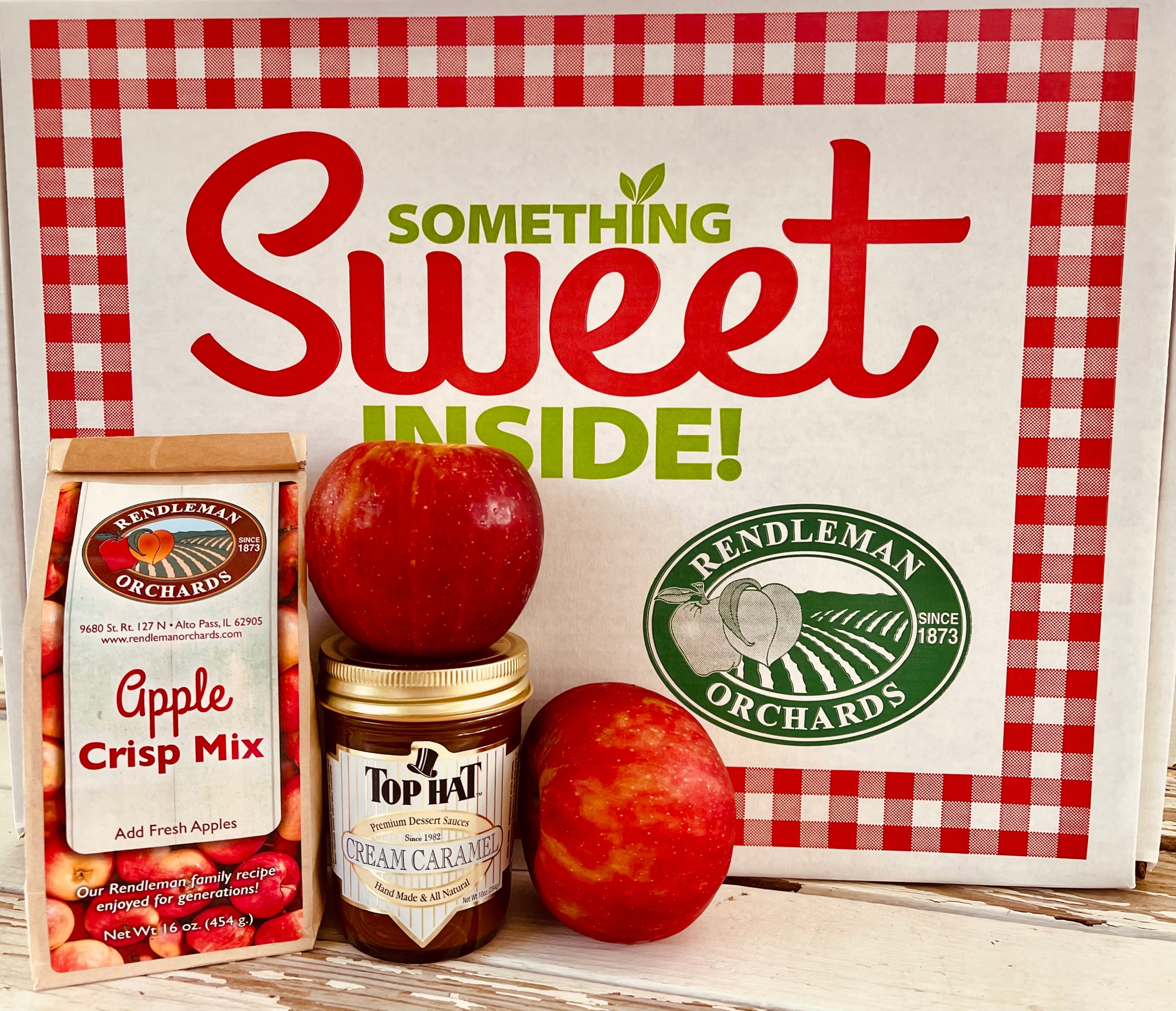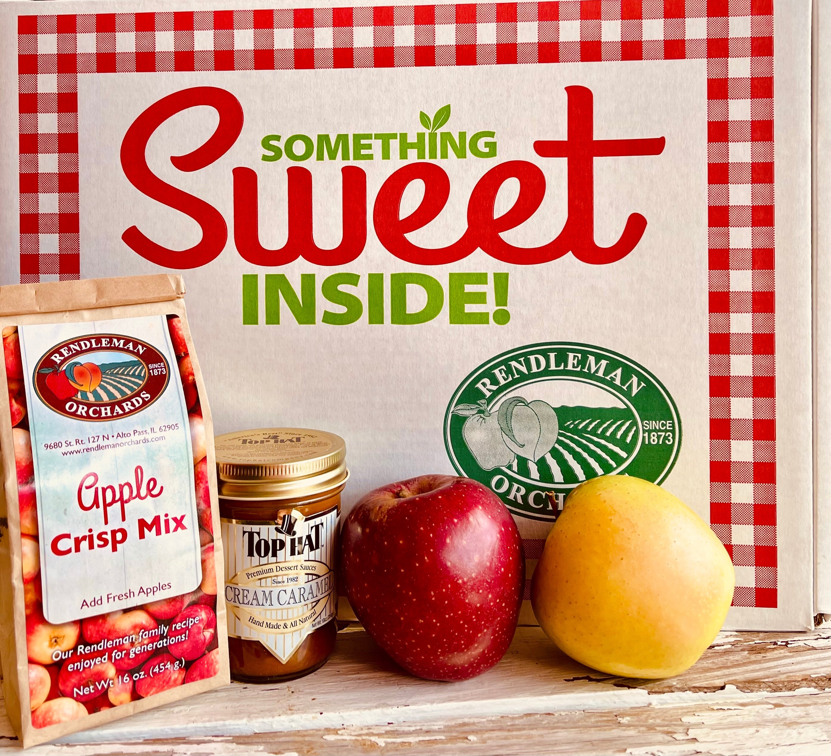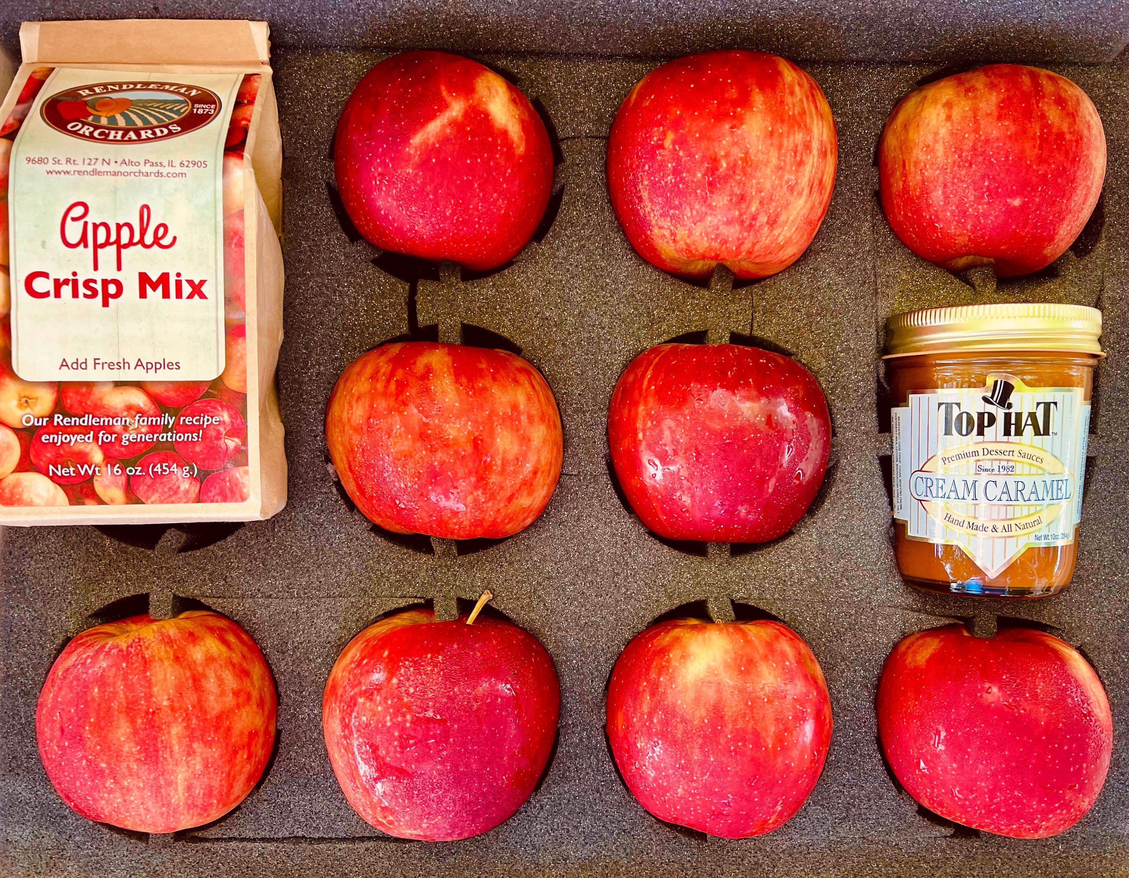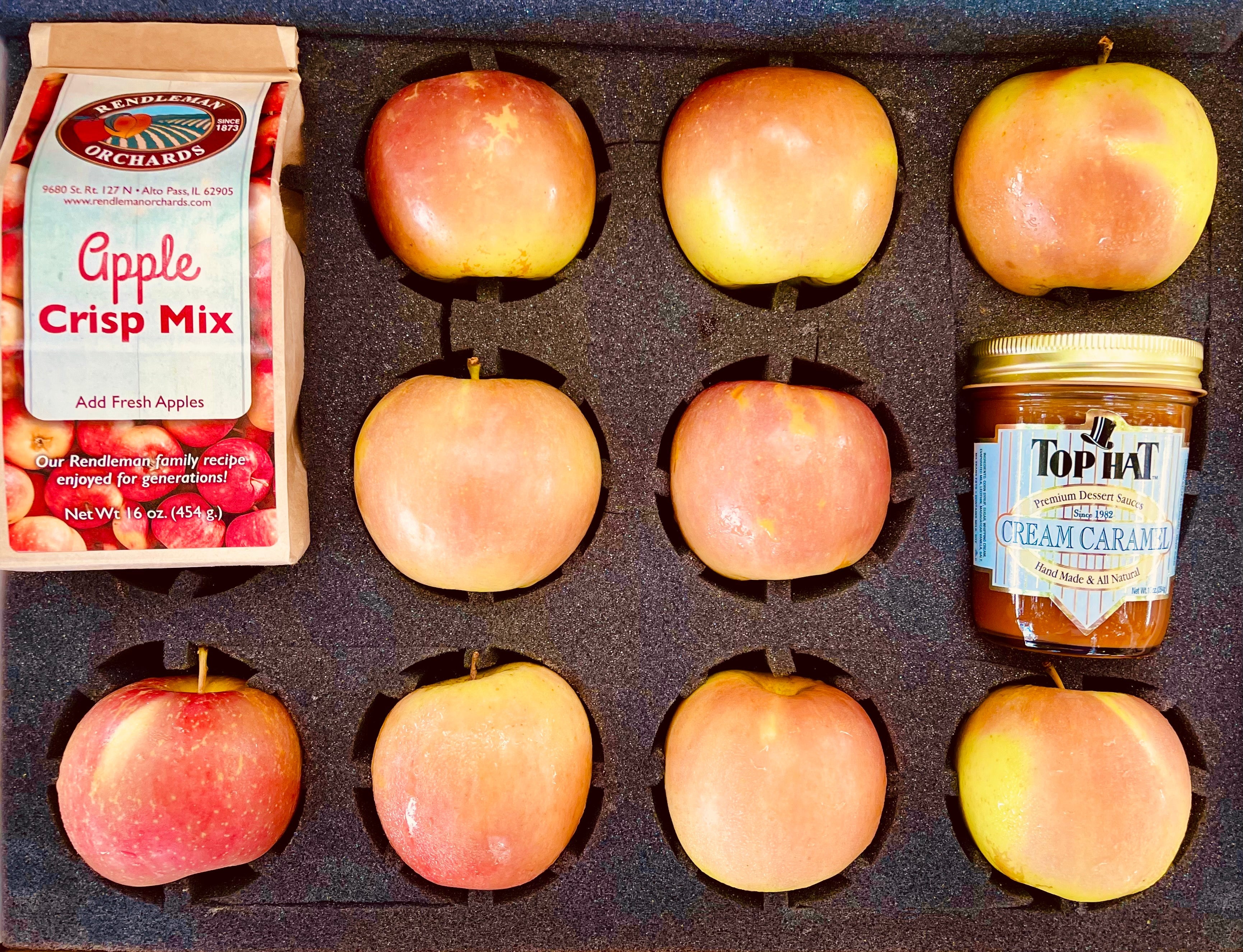 Our most FUN Gift Box yet! Create a country gourmet Apple Crisp with all you need included in the box! This activity kit includes 9 beautiful Rendleman Orchards apples of your choice, all hand-picked, along with our Rendleman family recipe Apple Crisp Mix from our 5th generation family farm, AND a jar of the most decadent cream caramel, delivered right to your door! All of these apples are wonderful for baking. Warm up some caramel and drizzle on top…yum! Use these extra sweet and fragrant apples to make the perfect snack dipped in the cream caramel! These apples are harvested during peak season, giving that fresh flavor you can only get straight from the orchard.