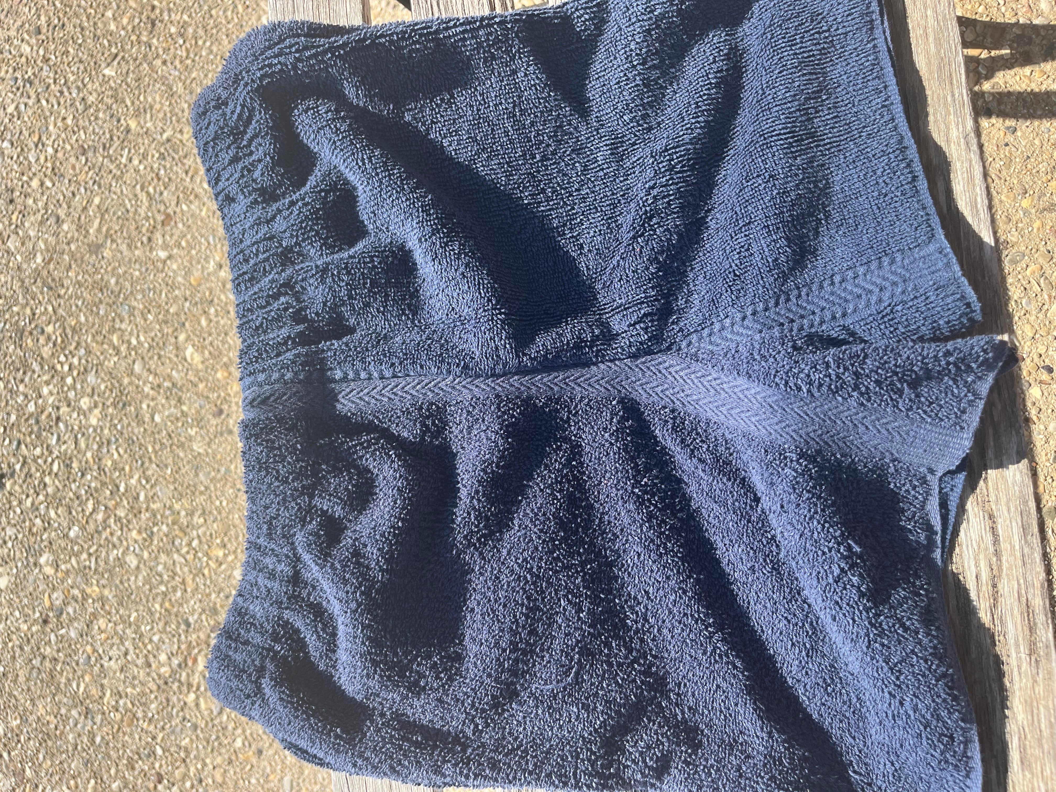Shorts made from a navy towel, perfect for summer days- especially by a pool! Elastic waistband and 4 inch inseam. Based on the Nike Boys size chart, size is boys M-L. Exact dimensions are 15" side length, 30" waist with elastic fully stretched and 26" waist with elastic not stretched, and 30" hip measurement.