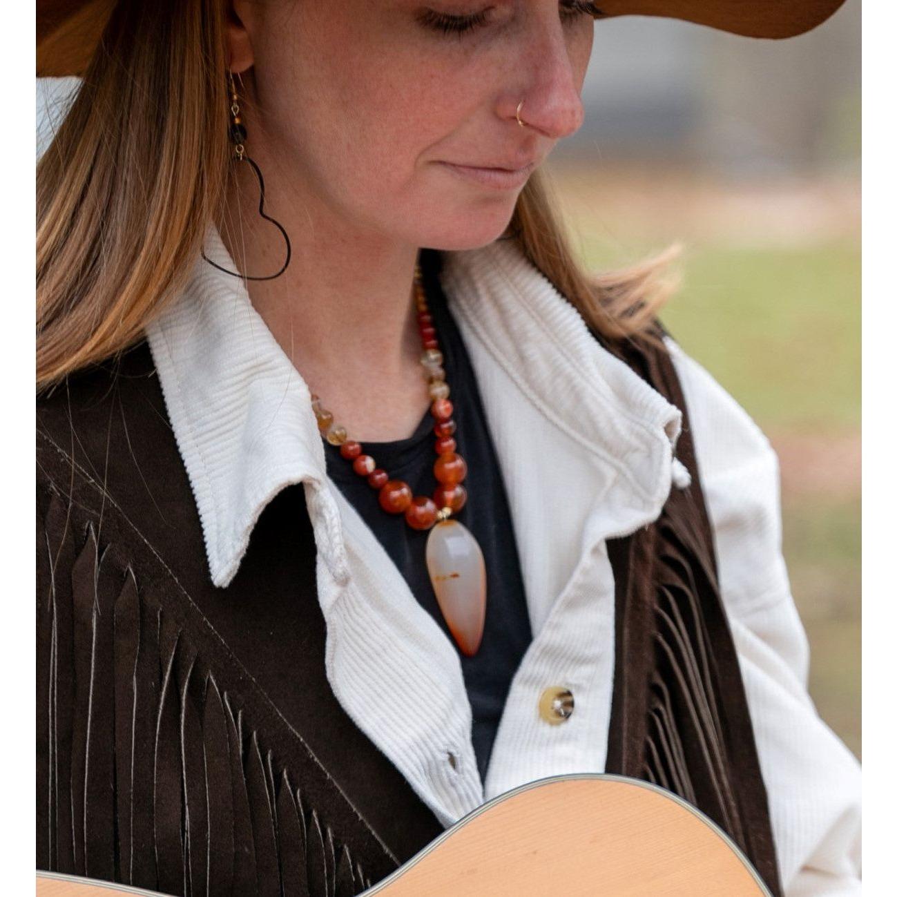 Add a pop of color and energy to your look with the Carnelian Point Statement Necklace. This striking piece features real Carnelian beads in various shapes and shades, complemented by vibrant Citrine beads. The Carnelian focal stone is a showstopper, blending rich oranges and whites for a radiant glow.
