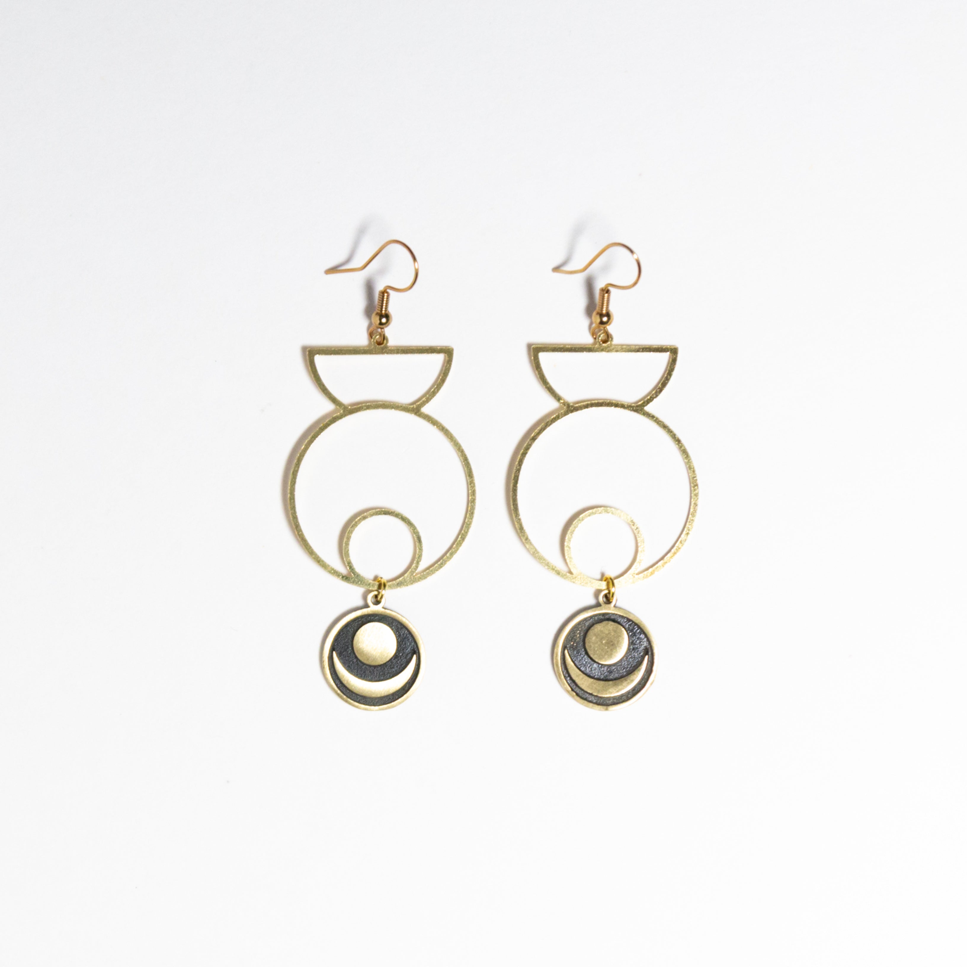 These earrings include circular geometry to symbolize spherical planets in gold plated brass with a round black charm with gold circle and crescent shapes attached below. Ear wires are gold plated and although the dangle length is nearly 3", they are very lightweight. Black and gold look striking together and will compliment many pieces of your wardrobe.