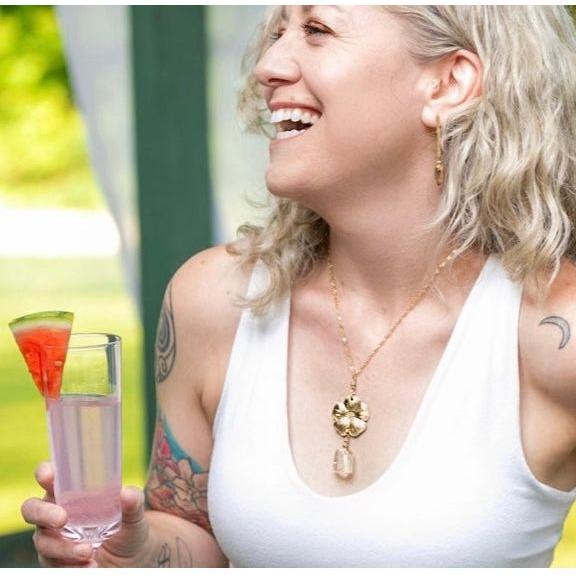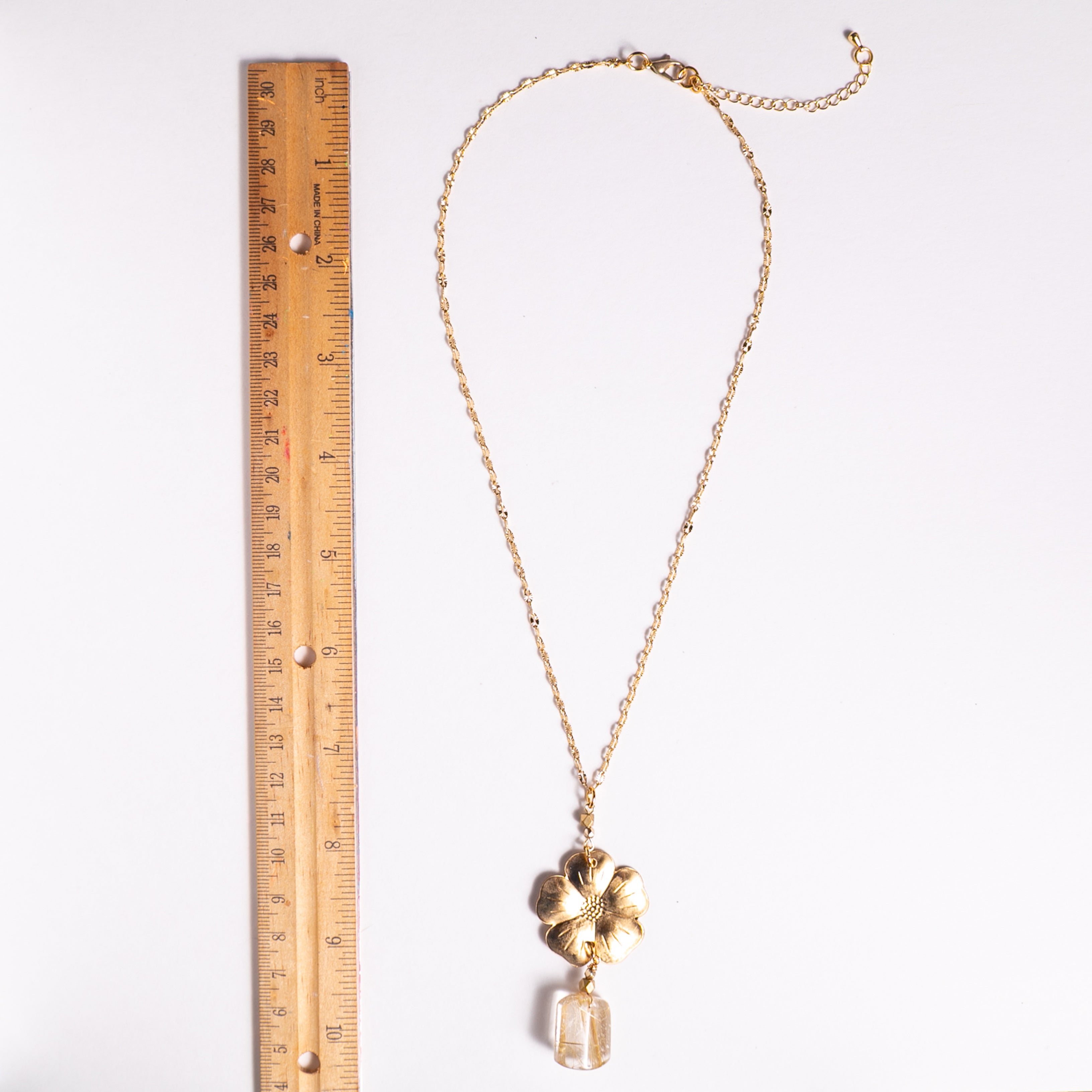 Elevate your style with the Golden Blossom with Rutilated Quartz Necklace, a stunning Art Nouveau-inspired statement piece that captures the essence of natural beauty. This elegant necklace features a golden dogwood blossom pendant paired with a gorgeous Gold Rutilated Quartz gemstone, known for its delicate golden needle-like inclusions within clear quartz.