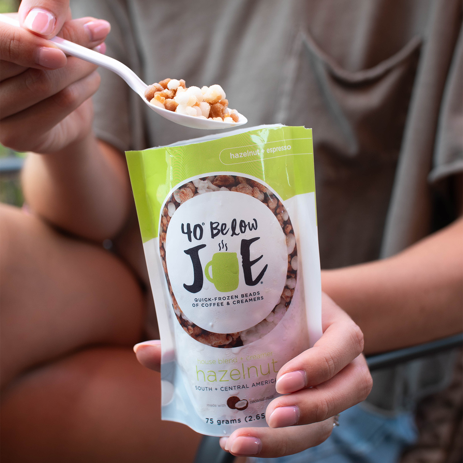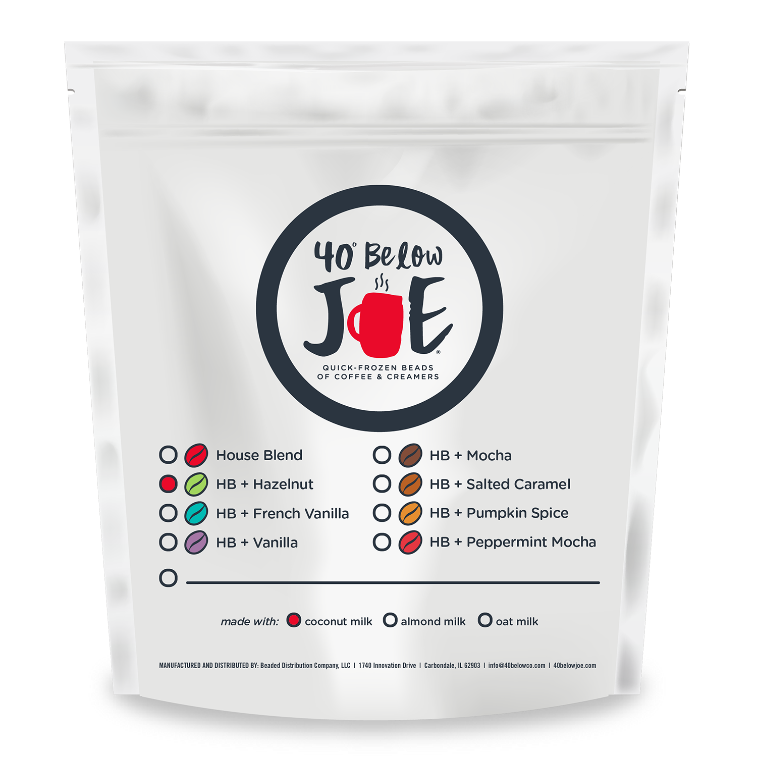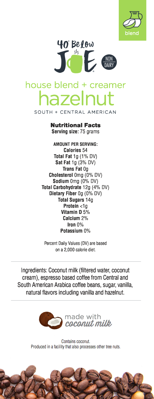 40 Below Joe® blends come pre-mixed with coffee and creamer beads. Our Hazelnut creamer is made with coconut milk and is mixed with our House Blend espresso. Enjoy this item cold. Grab a spoon and dig in. Now you can EAT your coffee!