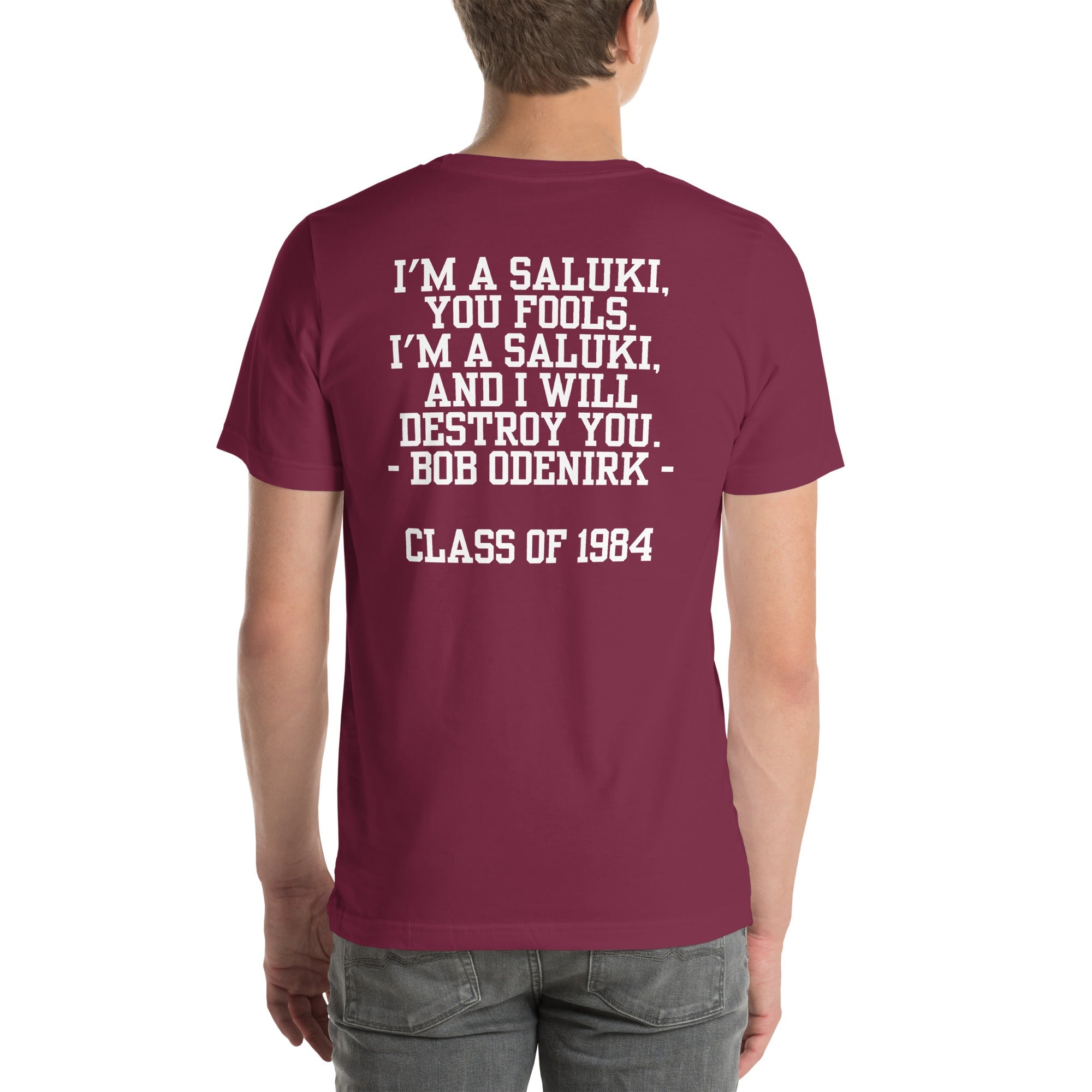 Channel iconic Saluki energy with this legendary tee! Featuring Odenkirk's student ID on the front and his unforgettable “I’m a Saluki, You Fools!” quote on the back, this shirt is a salute to fans who know true spirit.