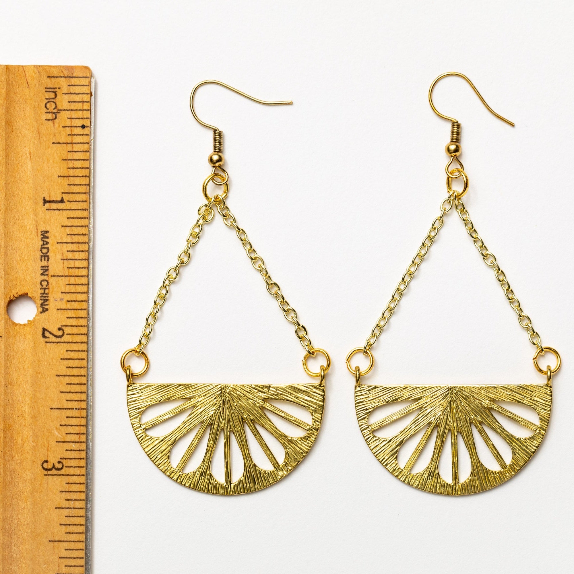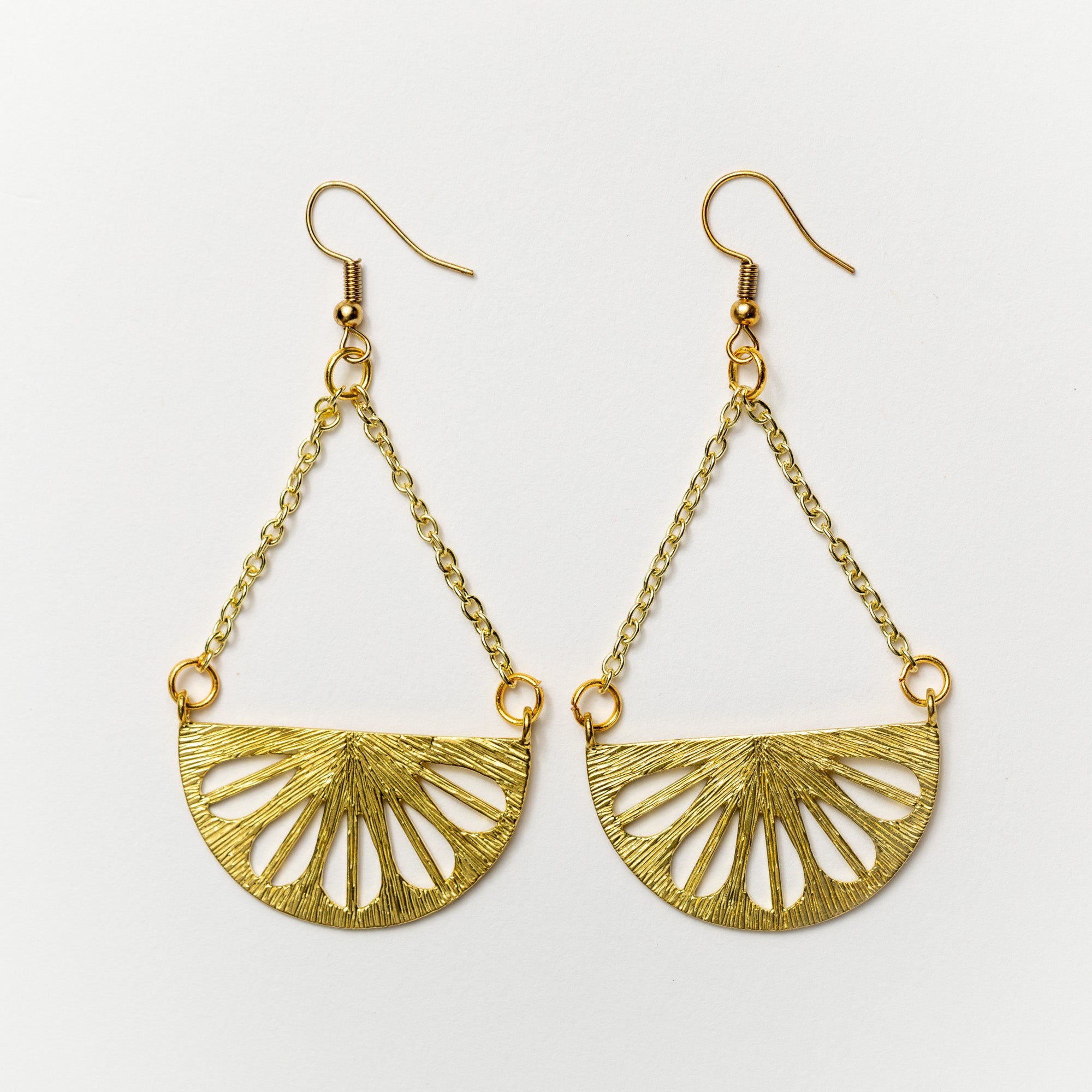 Add a touch of elegance and shimmer to any look with our Leaf Stencil Half Rounds earrings. The beautifully textured gold half-circle shape reflects light for a subtle, sparkling effect. Ornamental teardrop-shaped leaf cut-outs add an intricate design element, making these earrings a perfect addition to your jewelry collection.
