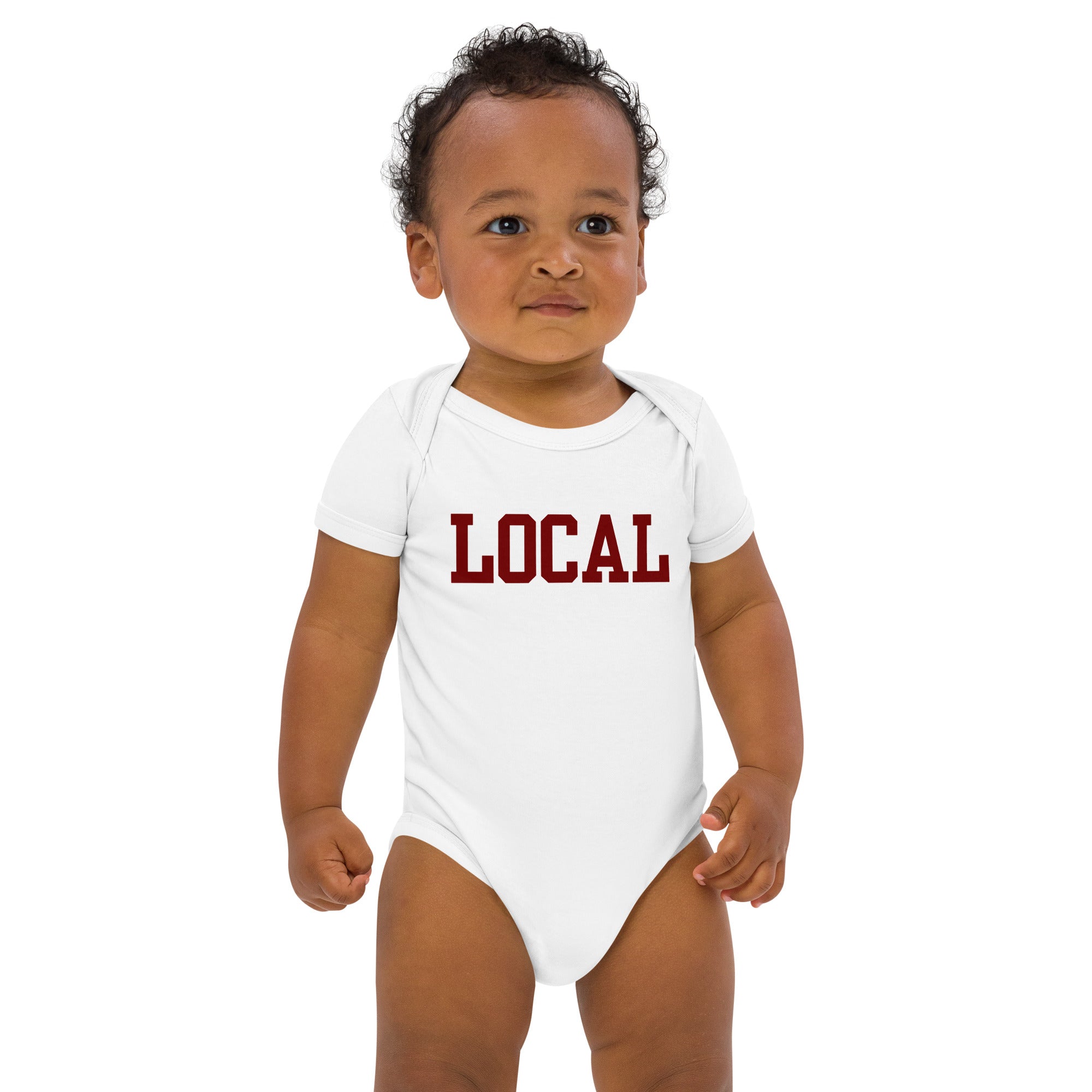 Material: 100% certified organic cotton Fabric Weight: 5.9 oz/yd² (200 g/m²) Fit & Feel: Soft, stretchy fabric for ultimate comfort Design: Envelope neckline for easy dressing Features: 3 self-colored, nickel-free poppers at the crotch Durability: Binding at the neck, arms, and legs for shape retention Start ‘em young — because local pride runs deep!