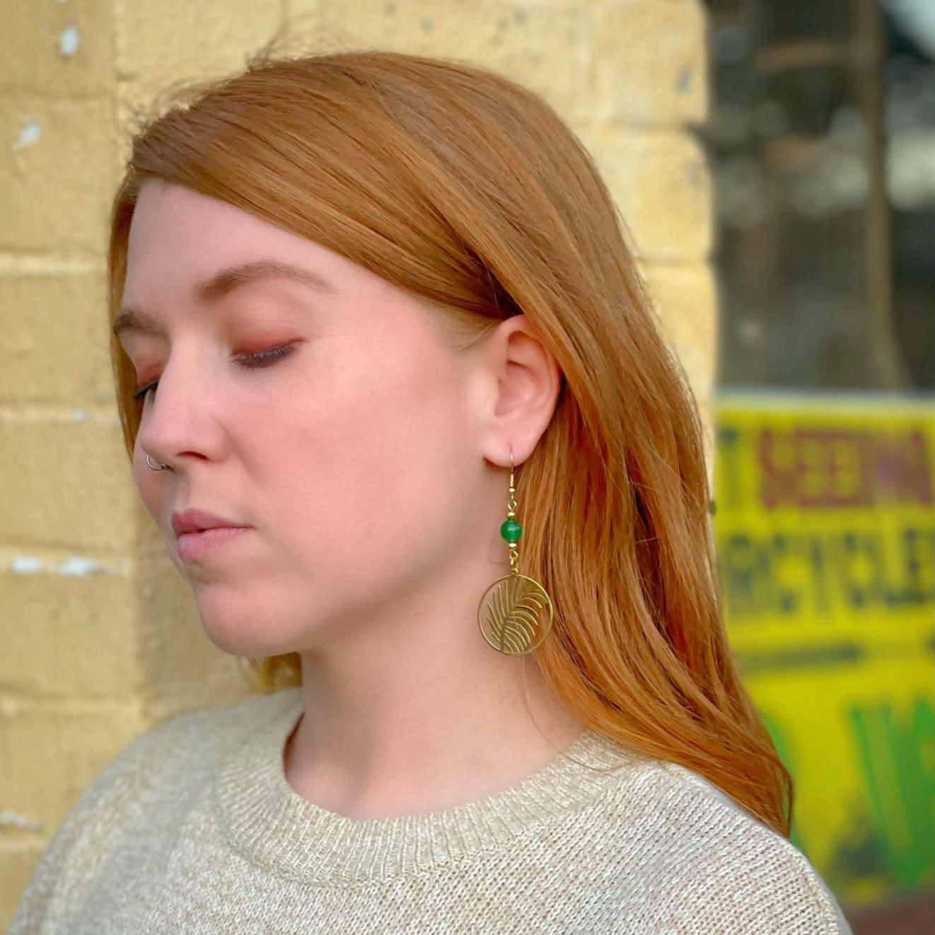 Transport yourself to tropical paradise with the Majesty Palm Leaves with Green Jade Earrings. Inspired by the lush foliage of exotic palm trees, these earrings feature laser-cut gold-plated brass palm leaves, paired with 8mm round green Jade gemstones for a nature-inspired statement piece.