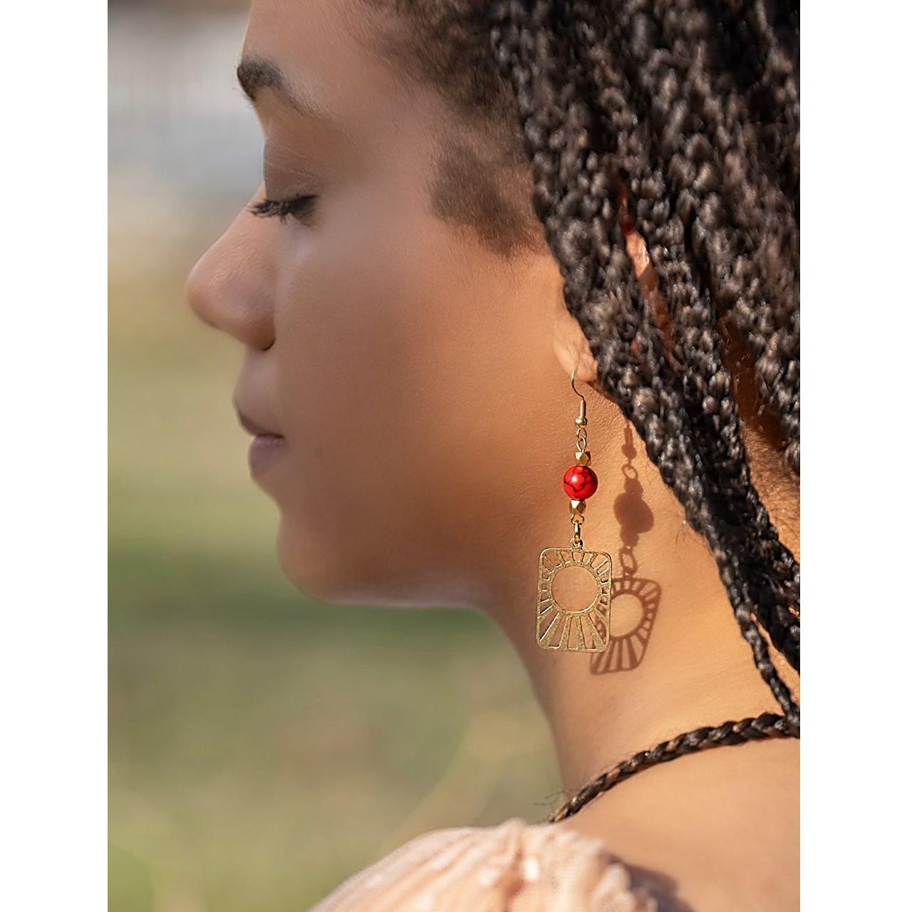 Channel the warmth of a Southwest sunset with our stunning Red Stone Sun Dangles. Inspired by the bold beauty of the desert, these earrings feature gold sun window charms with radiating beams, paired with Red Howlite beads. Red Howlite, a stunning substitute for Red Turquoise, mirrors the natural beauty of the desert with its black veining and matte finish.