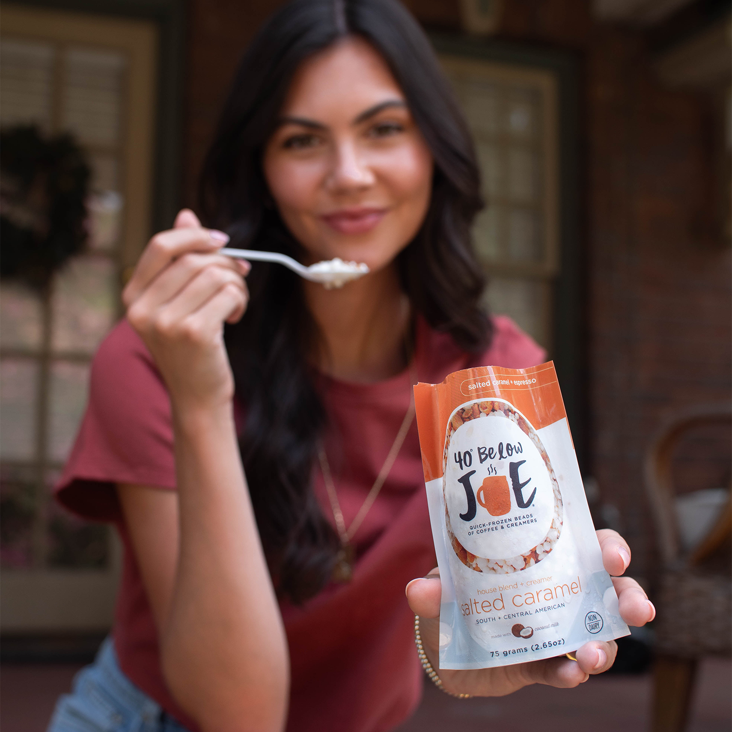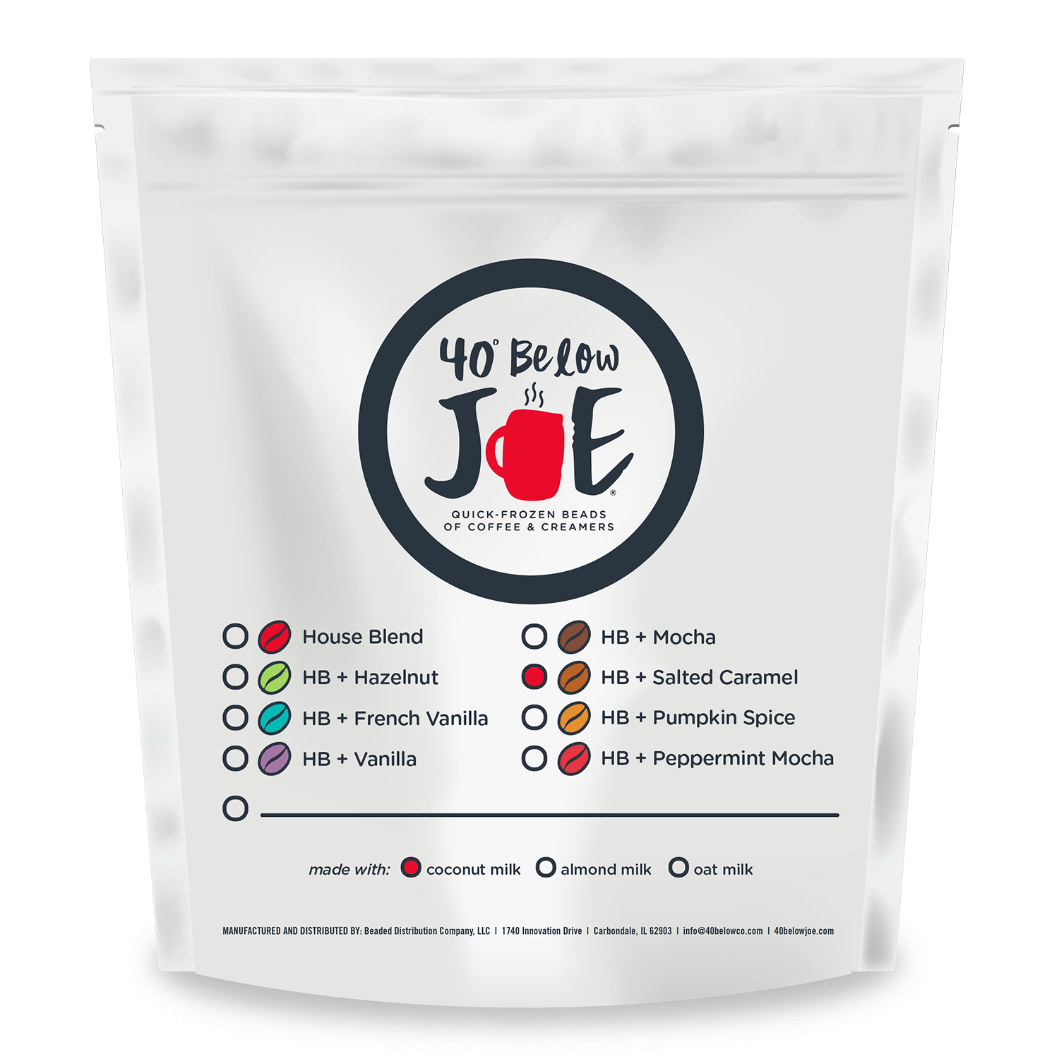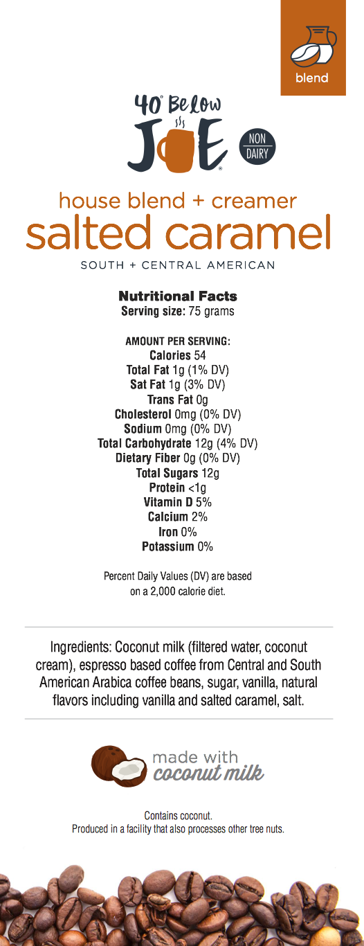 40 Below Joe® blends come pre-mixed with coffee and creamer beads. Our Salted Caramel creamer is made with coconut milk and is mixed with our House Blend espresso. Enjoy this item cold. Grab a spoon and dig in. Now you can EAT your coffee!