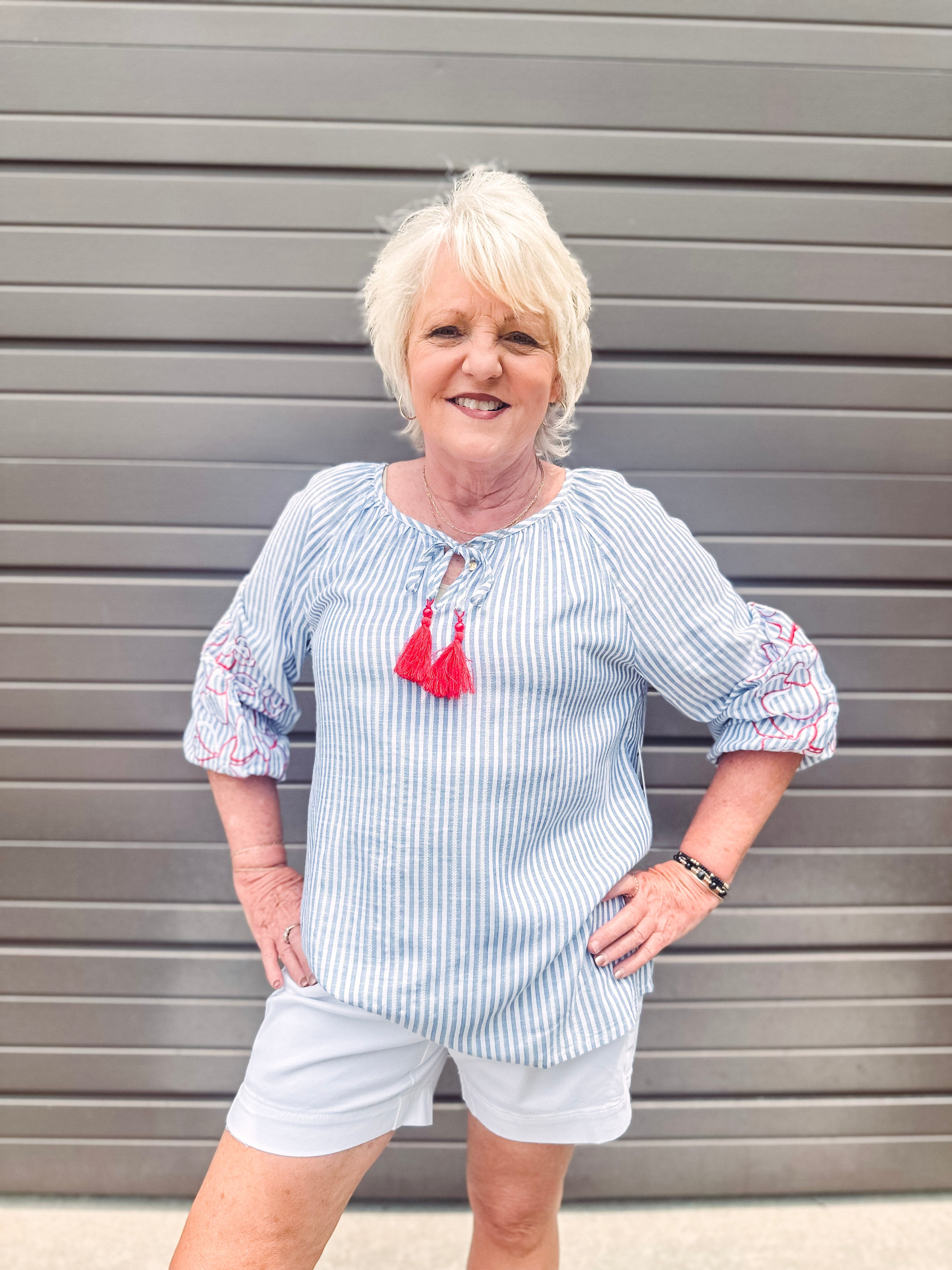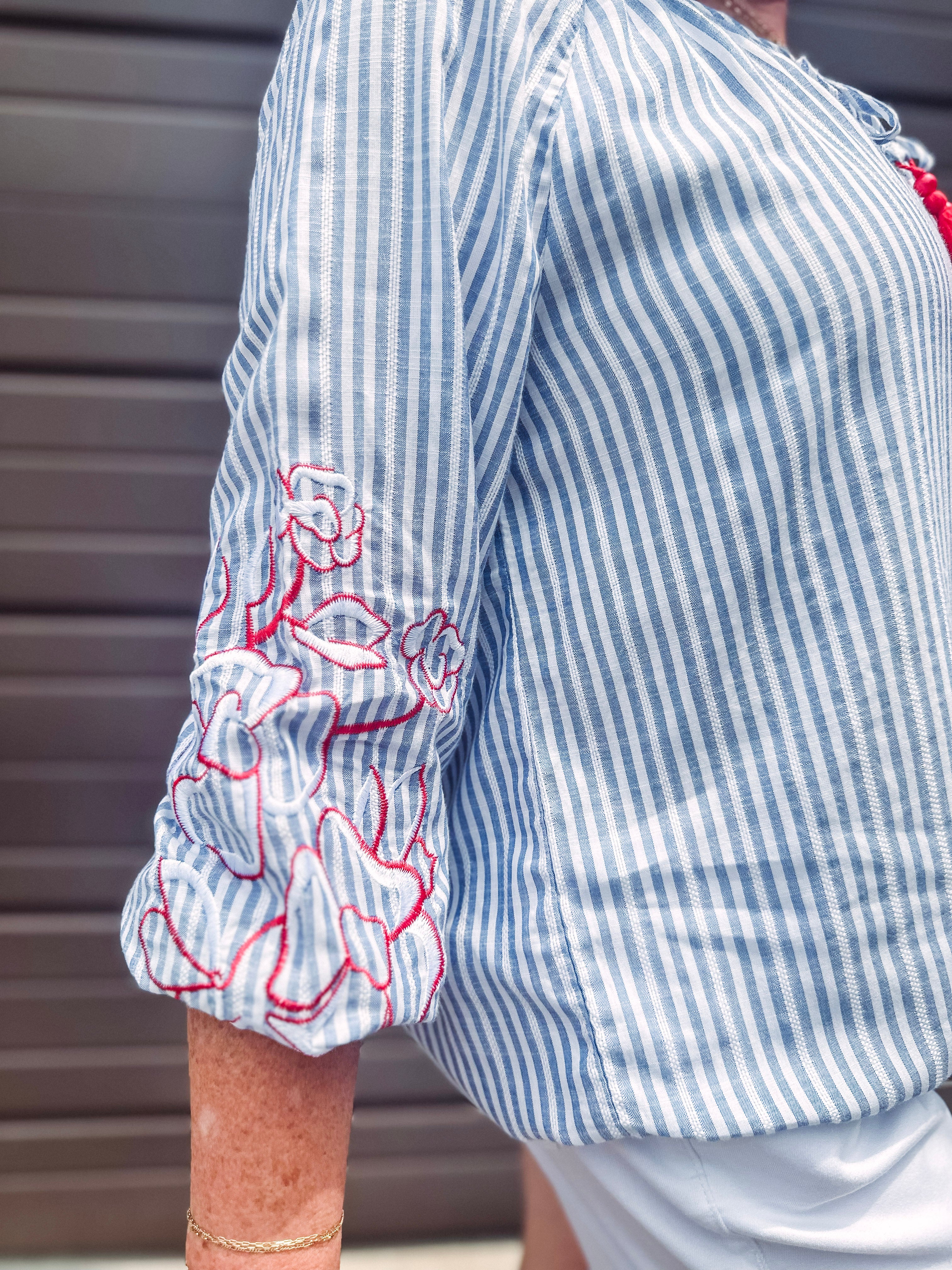 Embrace southern charm with this playful Tribal Embroidered Puff Sleeve Blouse. Featuring delicate embroidery and a classic blue stripe, its 3/4 sleeves and relaxed fit make it perfect for effortless style and comfort all day long.
