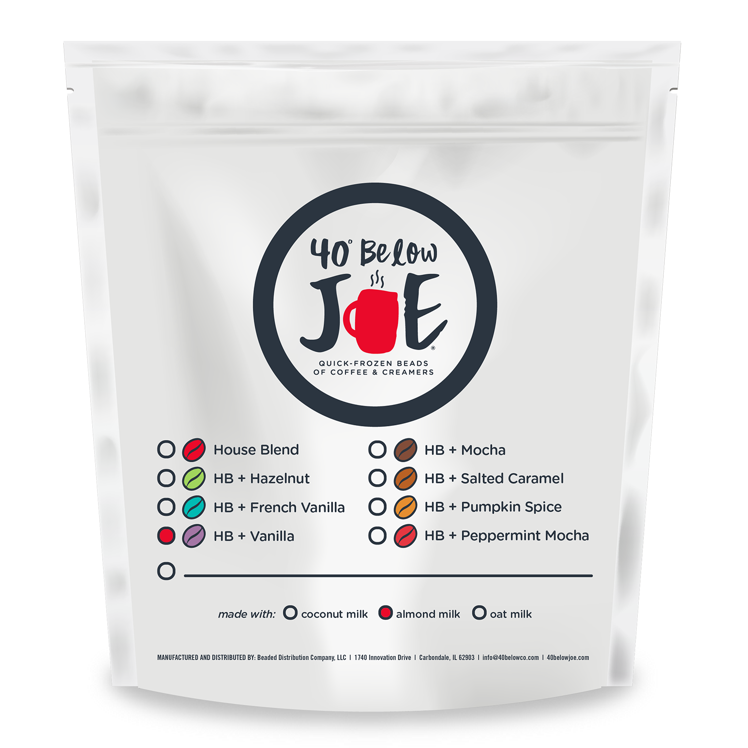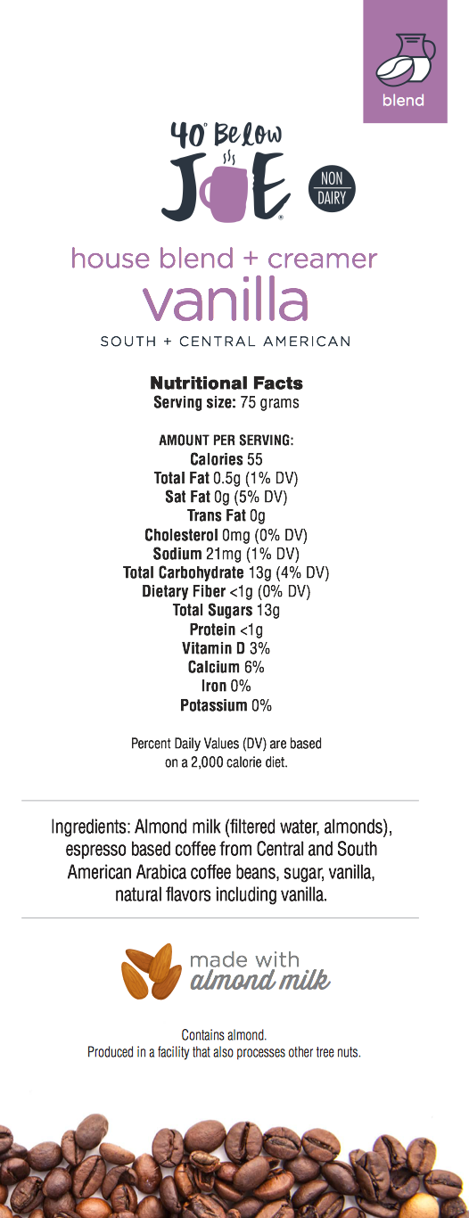 40 Below Joe® blends come pre-mixed with coffee and creamer beads. Our Vanilla creamer is made with almond milk and is mixed with our House Blend espresso. Enjoy this item cold. Grab a spoon and dig in. Now you can EAT your coffee!
