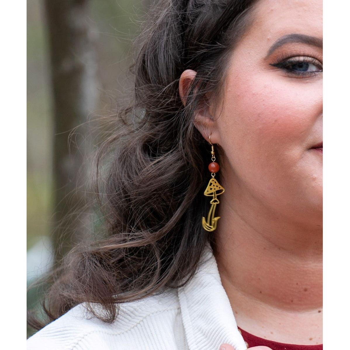 Embrace your whimsical side with these Wild Shrooms with Carnelian Earrings. Featuring tall, golden mushroom charms laser-cut from brass, these earrings are paired with earthy Carnelian beads in a warm, dark orange hue. Perfect for nature lovers and anyone with a playful spirit, these earrings are as lightweight as they are stylish, making them ideal for everyday wear.