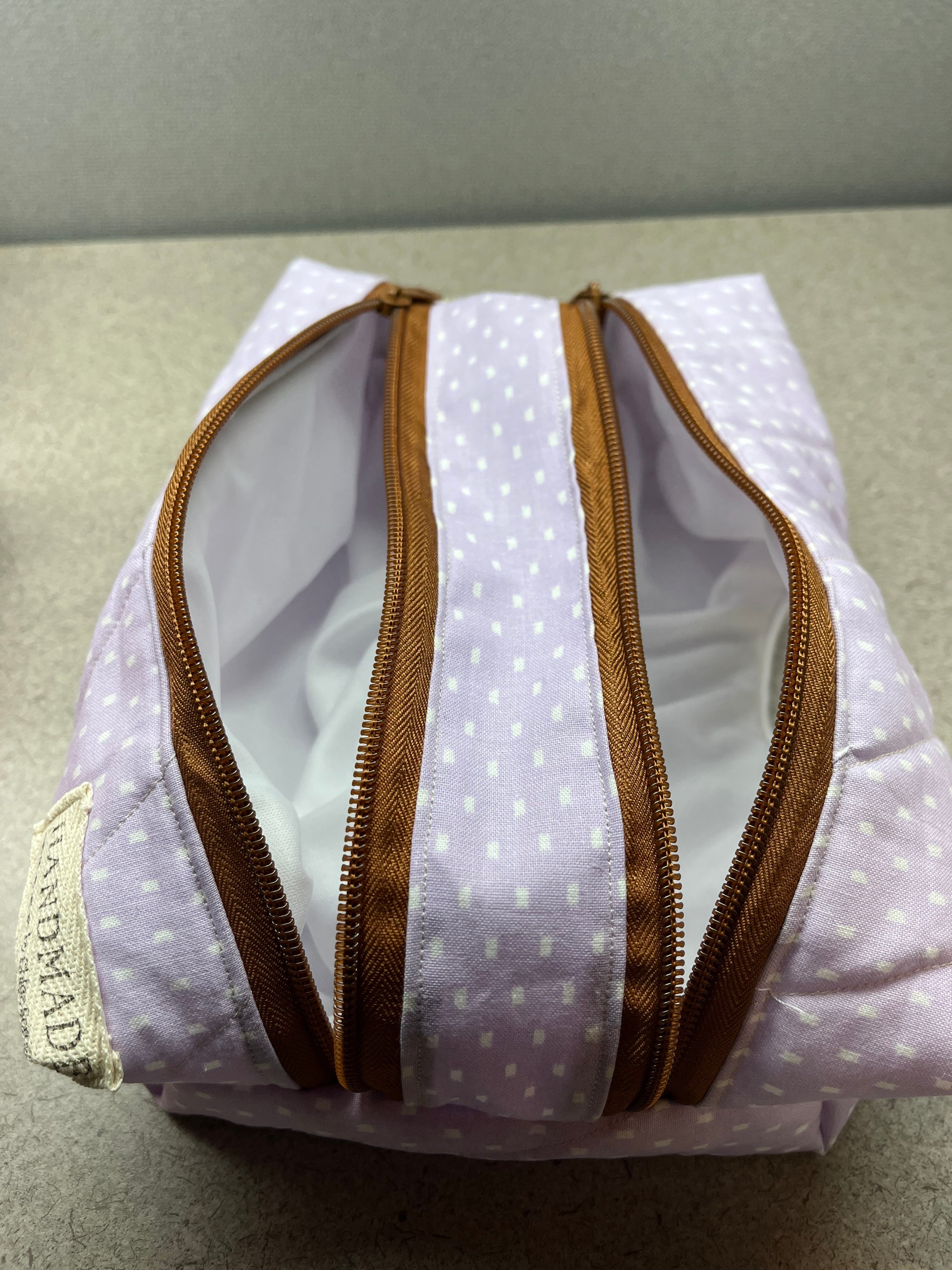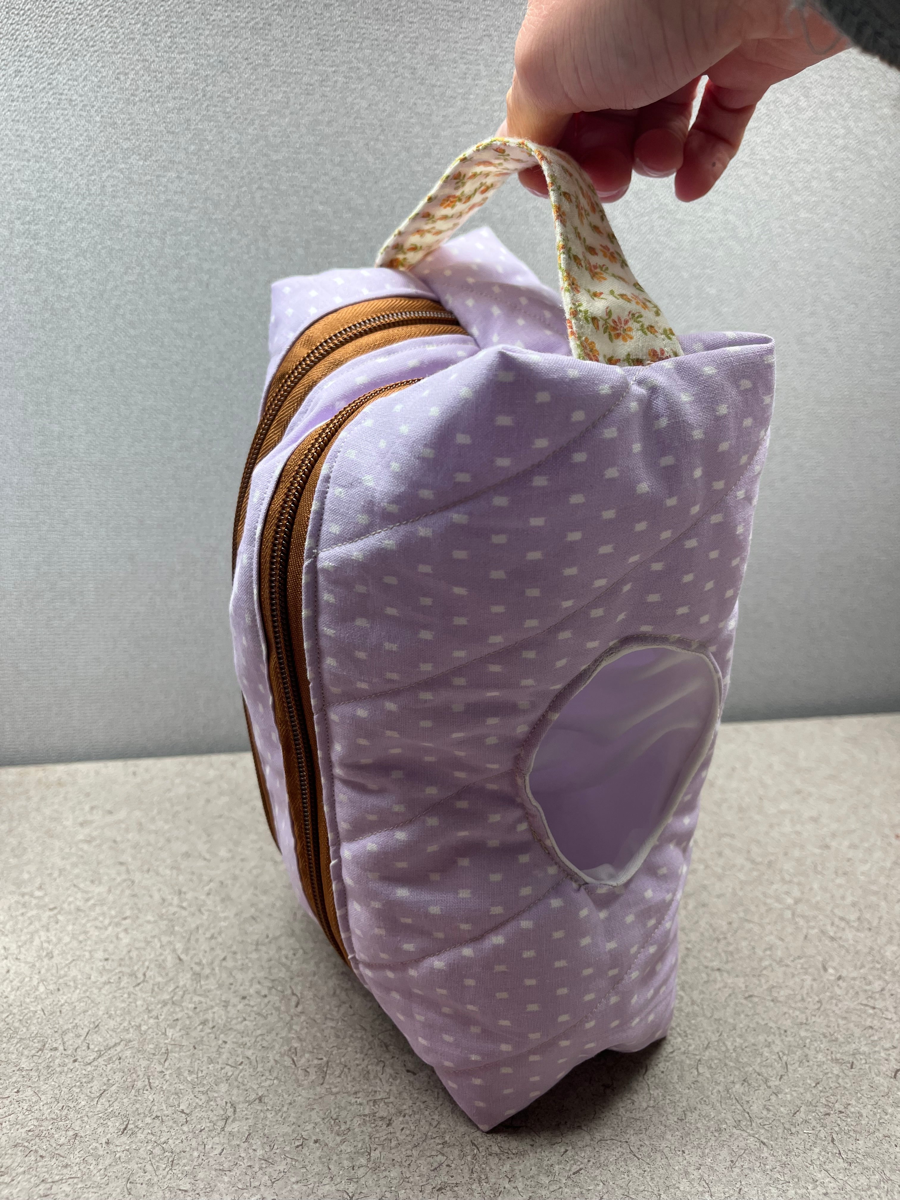 This two-in-one diaper and wipe bag is the perfect gift for the parent or parent-to-be! The bag consists of two pouches, one with a cutout that fits the lid of a baby wipe package and one that is perfect for diapers and other baby changing necessities. Each pouch is 3 in wide and 10 in long. Total dimensions of the bag are 10 in x 6.25 in x 3.25 in. Strap/handle is perfect for carrying or clipping onto another bag.