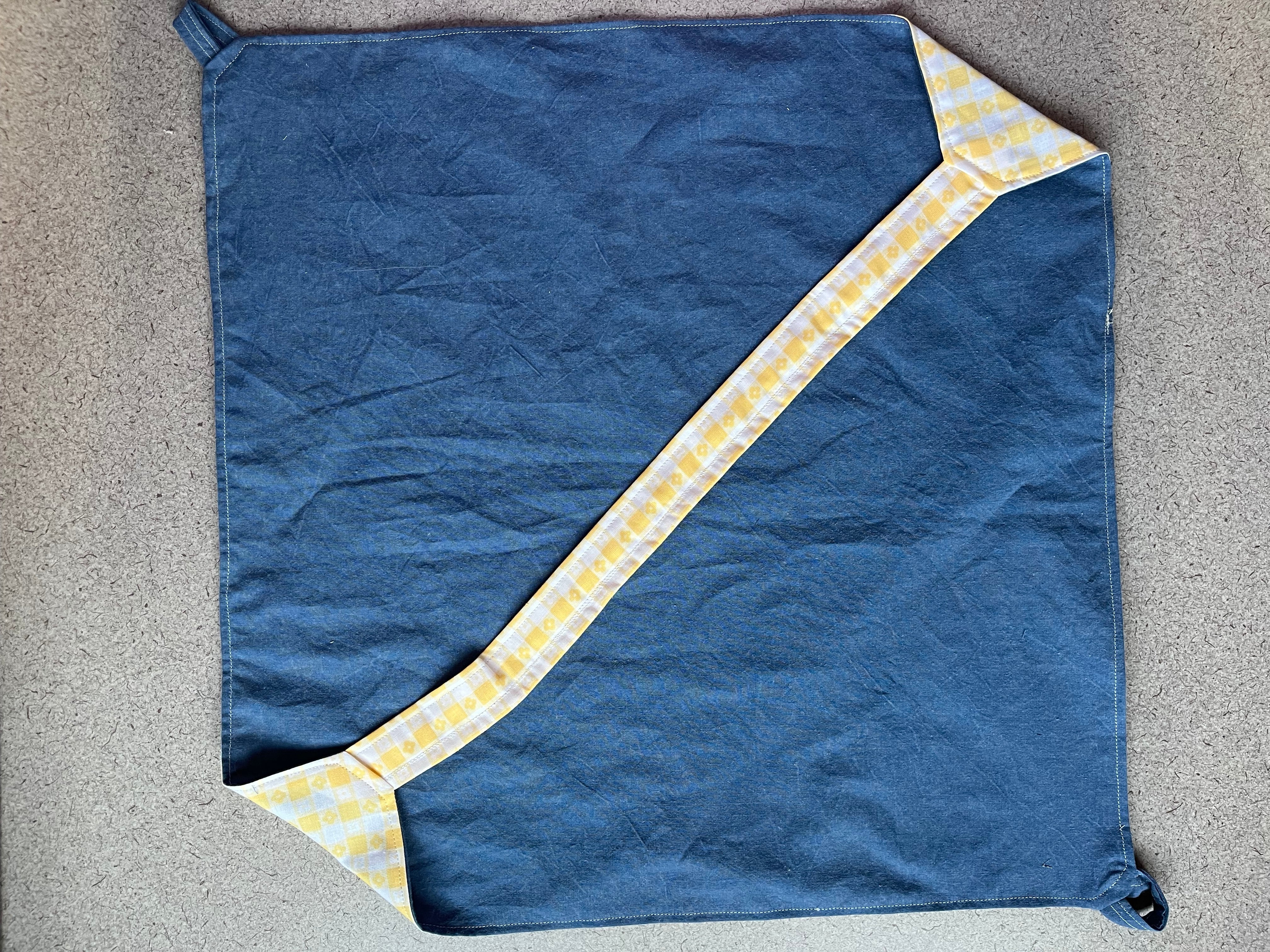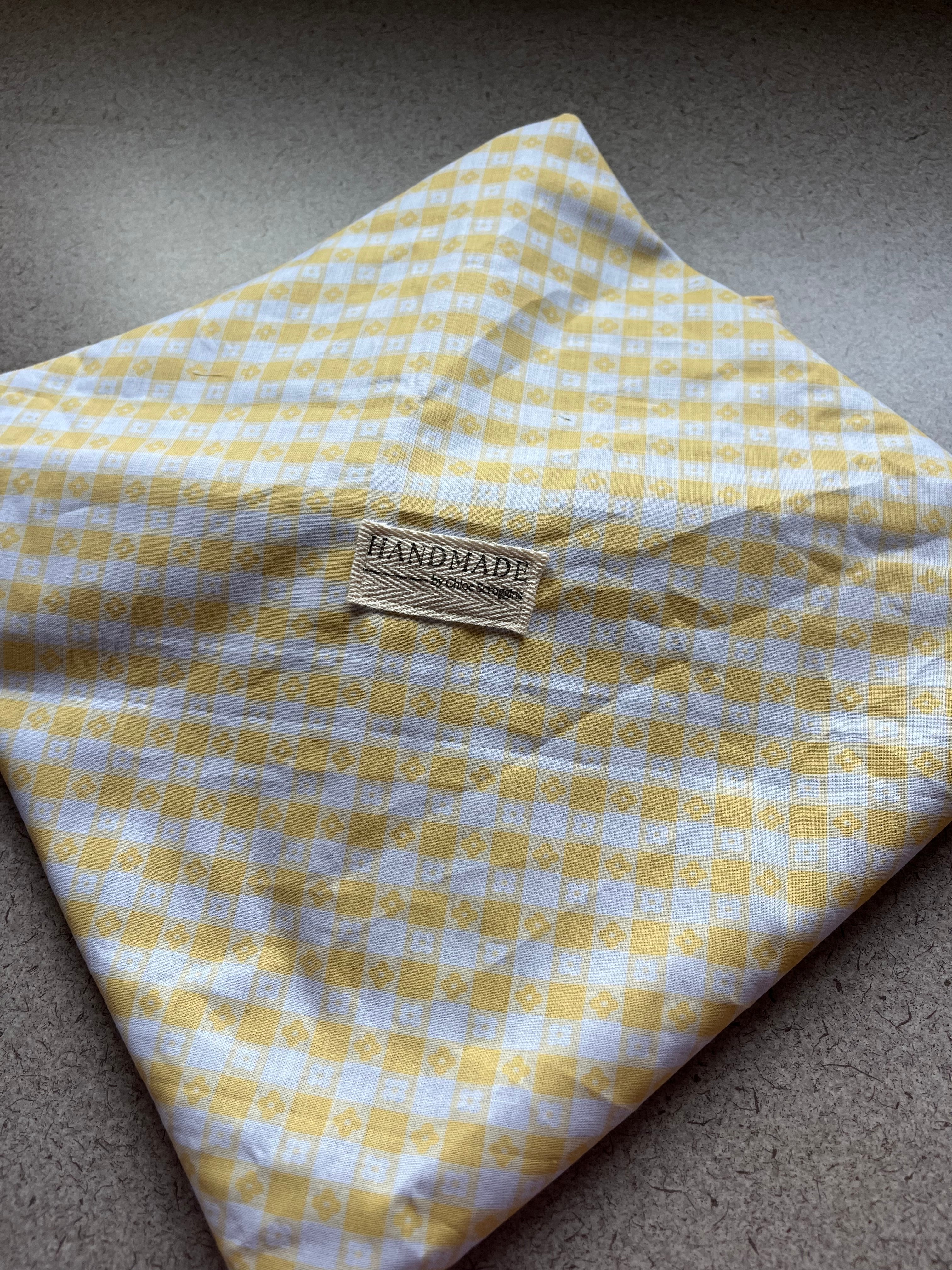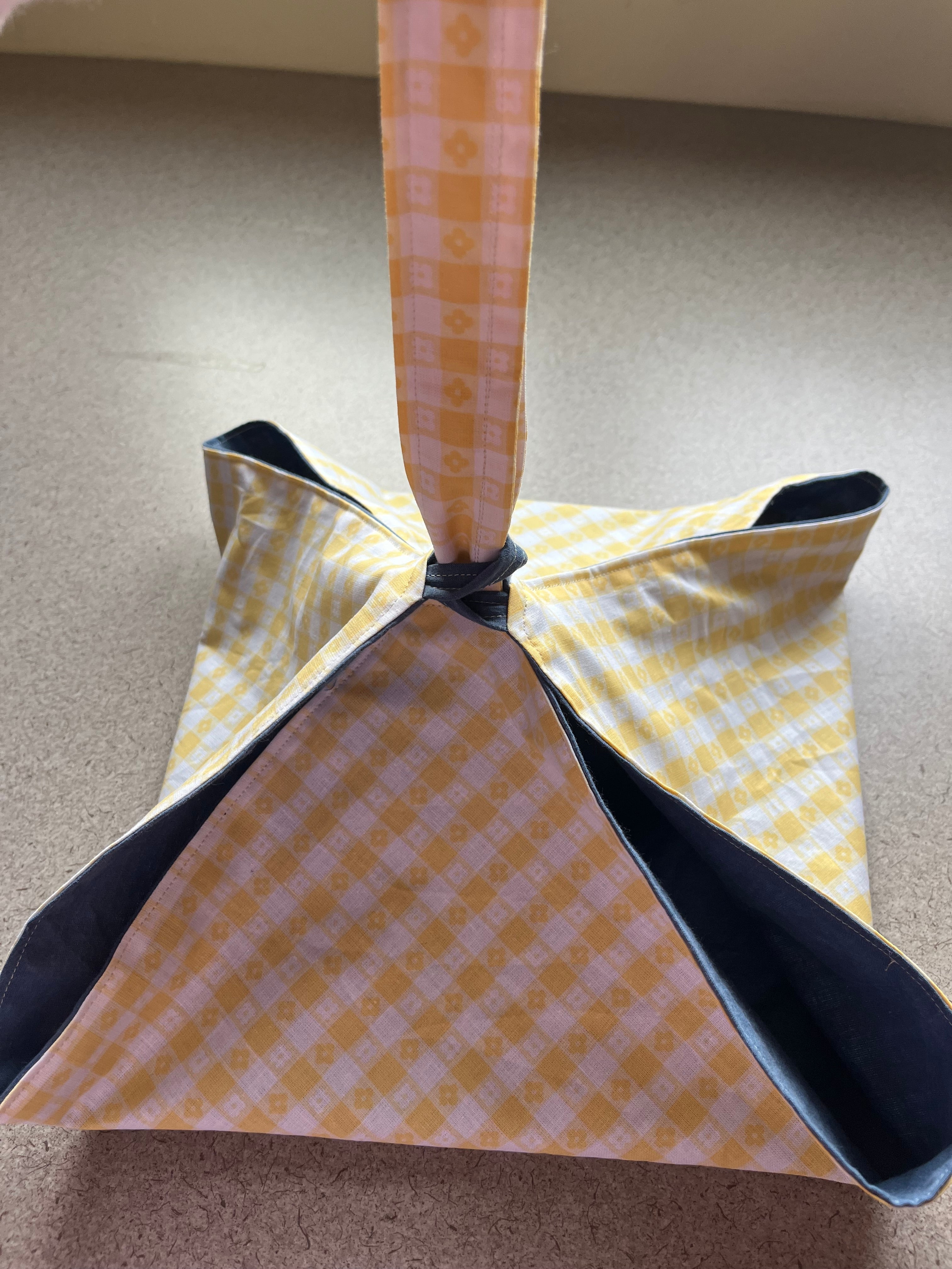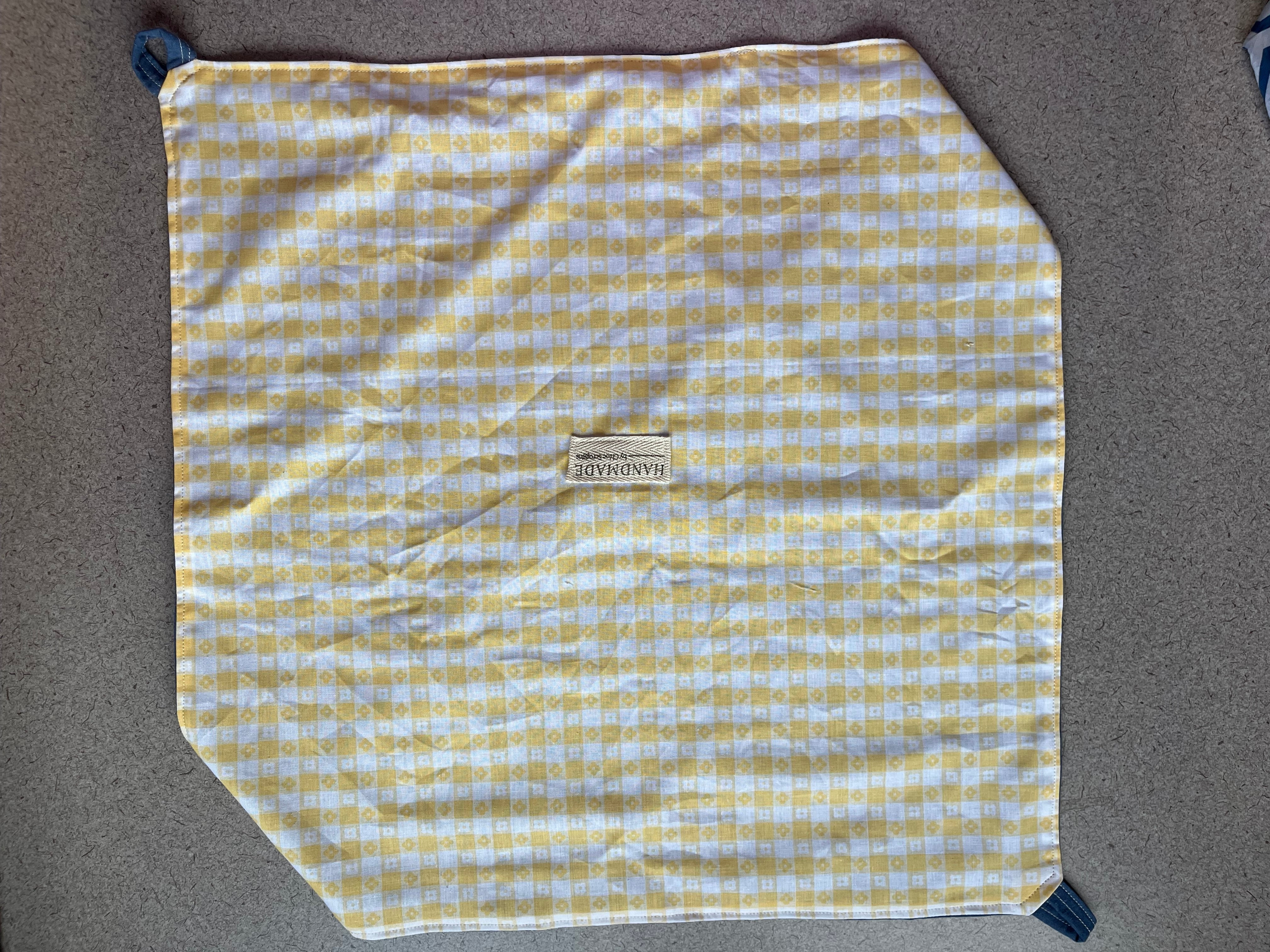 12" by 12" Pie/bread carrier with yellow checkered flower patterned fabric on the outside and blue fabric on the inside. Carrying strap pulls through two attached loops to create a bag with handle. Quilting cotton fabric.